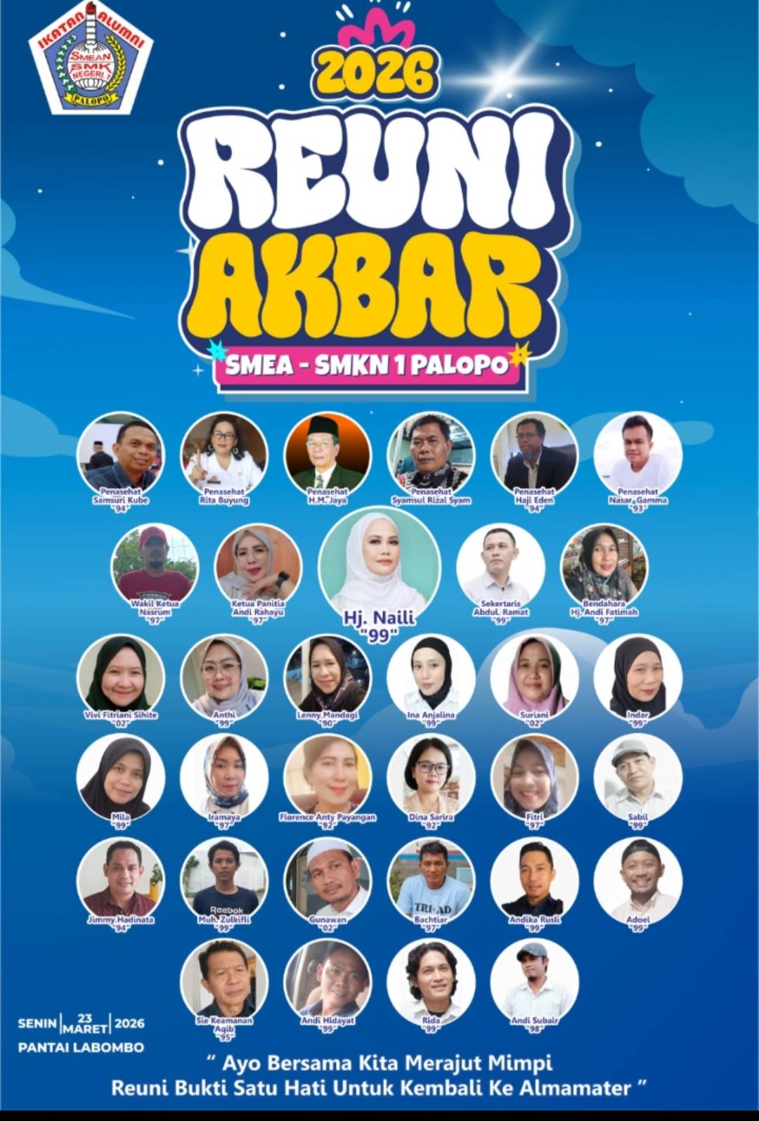 Panitia telah menetapkan reuni lintas angkatan ini digelar setelah Hari Raya Idul Fitri 1447 H, tepatnya tanggal 23 Maret 2026 mendatang, di Pantai Labombo, Kota Palopo.