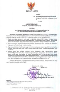 Ada 4 point penting dalam surat edaran Bupati Luwu, diantaranya adalah; (1) Kepala OPD/Unit Kerja agar menghimbau seluruh ASN maupun Tenaga Honorer untuk tetap menjaga pola hidup sehat/kebersihan di lingkungan rumah, kantor dan tempat tempat umum lainnya, serta mengintruksikan agar senantiasa mengikuti protokol kesehatan; (2) Semua OPD/Unit Kerja menyediakan thermoscan, hand sanitizer dan masker di lingkungan kantor/unit kerja masing masing; (3) Bagi OPD/unit kerja yang memberikan pelayanan langsung untuk memperhatikan physical distancing (jaga jarak aman) sebagai salah saku upaya menekan penyebaran virus COVID-19.