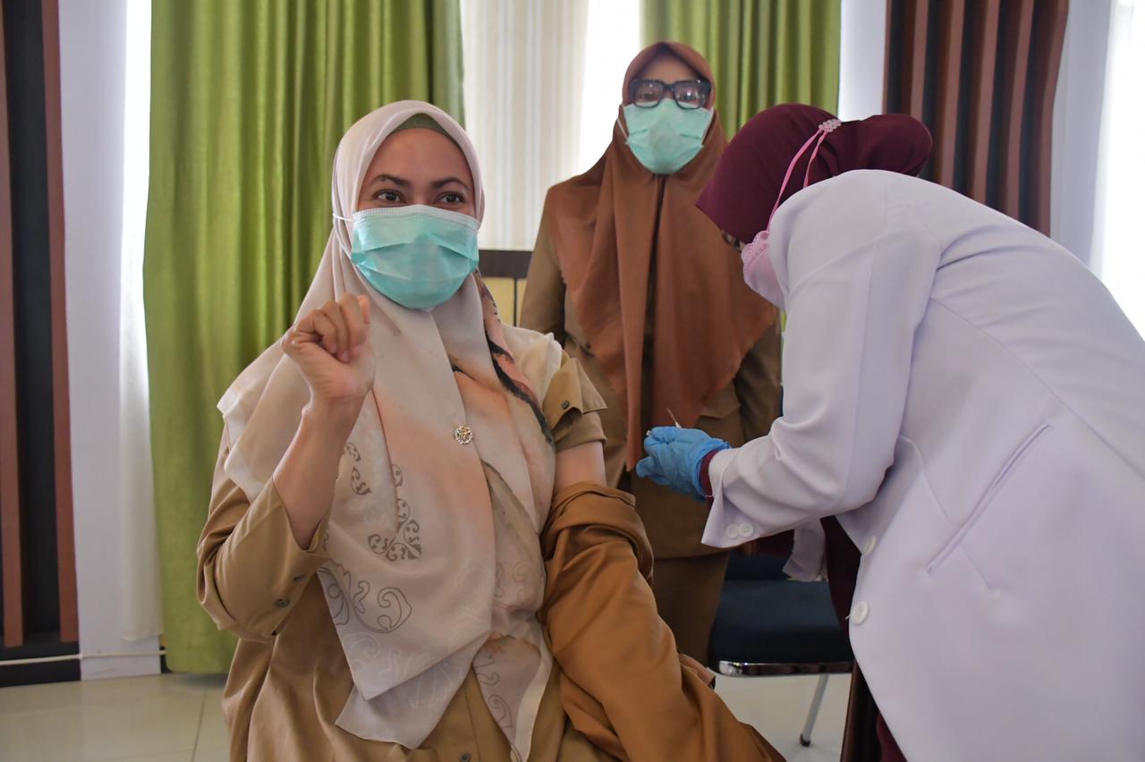 Luwu,Lintera News — Bupati Luwu Utara, Indah Putri Indriani, menerima vaksin dosis kedua pada pelaksanaan Vaksinasi Covid-19 Tahap I, Senin (15/2/2021), di Aula La Galigo Kantor Bupati Luwu Utara. Selain Bupati Luwu Utara, Forkopimda lainnya ikut menerima vaksinasi dosis kedua, di antaranya Kapolres Luwu Utara AKBP Irwan Sunuddin, Perwira Penghubung (Pabung) Kodim 1403/Sawerigading Mayor Arm Syafaruddin, dan Kajari Luwu Utara Haedar.