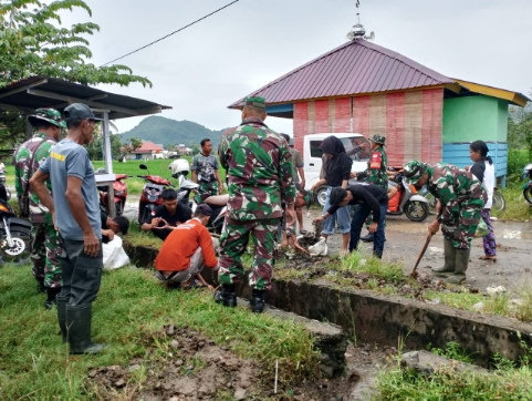 LUWU,Linteranews | Personil Koramil 1403-04/Padang sappa,jajaran Kodim 1403/Palapo,melaksanakan kegiatan gelar kerja bakti bersama pemerintah desa Tanarigella dan karang taruna desa Tanarigella dengan sasaran bersihkan tumpukan sampah² dan saluran irigasi serta rumput di kanan’kiri bahu jalan,Kegiatan tersebut berlangsung di pasar rakyat Bua,Kecamatan Bua,Kabupaten Luwu,Selasa (24/02/2026).